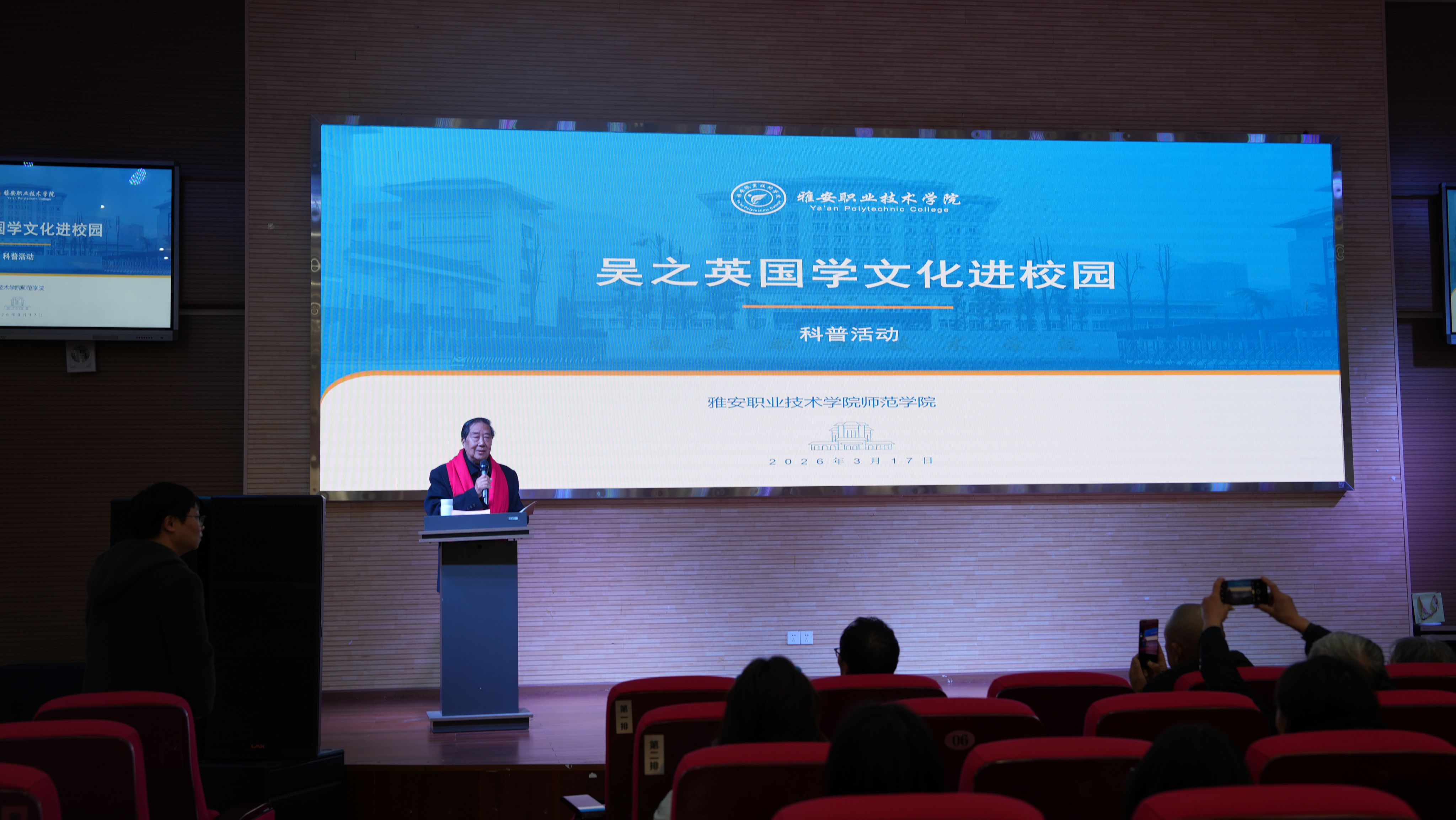 3月17日,“吴之英国学文化进校园”科普活动在学校青年路校区圆弧大厅举行。活动特邀四川省著名书法家吴洪武、四川省晏阳初研究会雅安分会名誉会长李正学等12位专家学者,学校260名师生代表参加活动。本次活动以“传承吴之英精神,弘扬国学文化”为主题,通过专题讲座、书画展览、学术研讨等多元化形式,为师生带来了一场沉浸式的文化盛宴,旨在砥砺家国情怀,激发使命担当。活动精心设计,环环相扣,分为专题讲座、主创面对面...