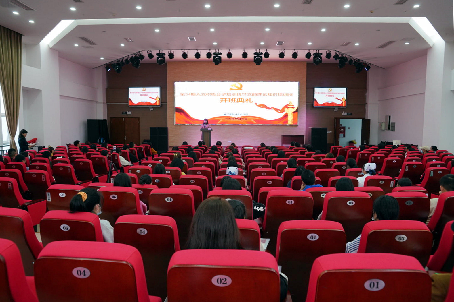 10月20日下午2点,学院党校第34期入党积极分子培训班暨党的理论知识培训班在青年路校区汇雅厅举行了开班典礼。结合我院学生分校区封闭管理的实际情况,考虑疫情防控的常态化需要,本次培训实施“线上、线下混合式”教学,确保云端学习不打烊,疫情防控不松懈,线上线下同频共振、同步发力。学院党委副书记付洪涛、各党总支(直属党支部)书记、党委组织部相关人员和82名青年路校区参训学员参加了线下开班典礼,132名经开区、育才路校区参训学员同步观看了线上直播。开班典礼由学院党委委员、组织部部长、人事处处长刘永恩主持。