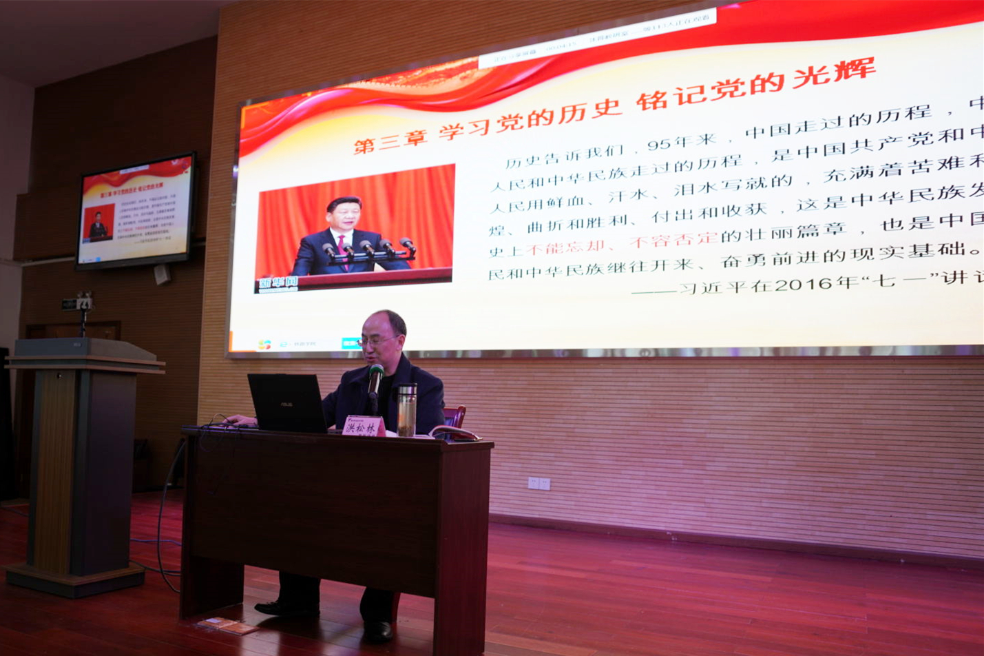 开班典礼结束后,由学院人事处副处长、机关后勤第二党支部书记洪松林为学员们讲授第一课:《学习党的历史 铭记党的光辉》,全体学员认真听讲,线上线下隔屏互动,学习积极性高。
