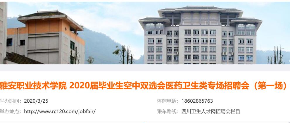 为降低疫情对我院毕业生就业影响,贯彻落实川人社办发〔2020〕24号《关于做好疫情防控期间有关就业工作的通知》文件要求,搭建高校毕业生就业供需对接平台,实现毕业生更高质量、更充分就业,我院于3月24日-25日联合四川卫生人才网(www.rc120.com)成功举办了“雅安职业技术学院2020届毕业生空中双选会医药卫生类专场(第一场)”。