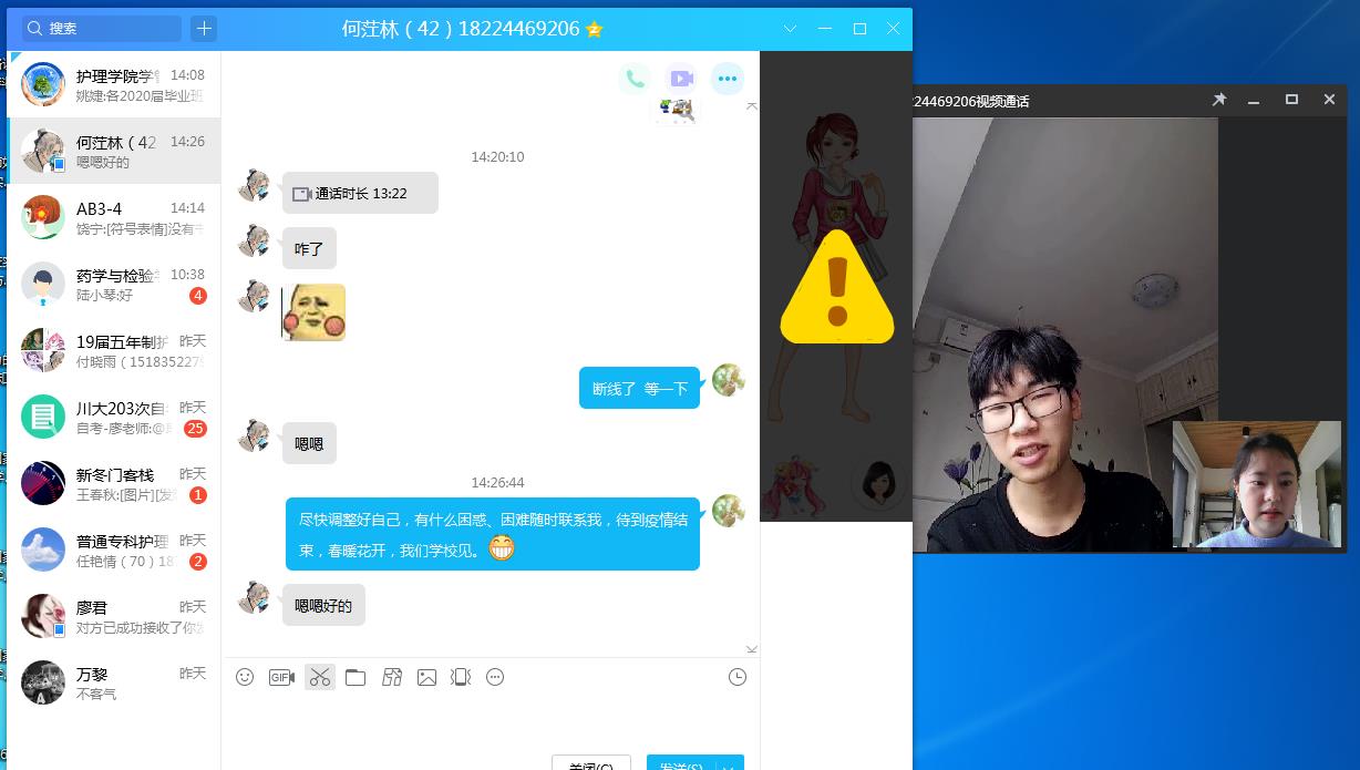 辅导员黄莉媛利用空闲时间进行知识充电,学习关于新型冠状病毒的宣传视频,积极筹备班级网上活动内容。阴妮娜身怀六甲,仍然利用夜间召开班级线上班会,她从网络视频引入话题,从防疫角度及学科专业引导学生正确认识新型冠状病毒和肺炎疫情。