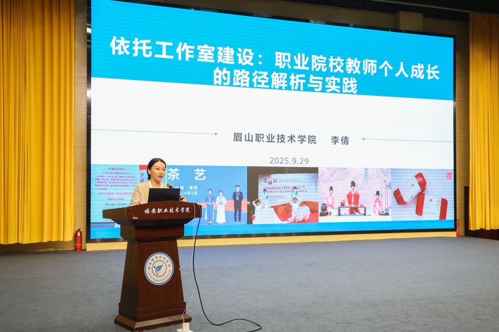 会议培训环节,眉山职业技术学院李倩教授以《依托工作室建设:职业院校教师个人成长的路径解析与实践》为题,结合个人成长经历,畅谈职业教育趋势,解读工匠成长密码,并重点分享了通往卓越的七条成长路径,为全体教师迈向卓越提供了坚实有力的行动指引。