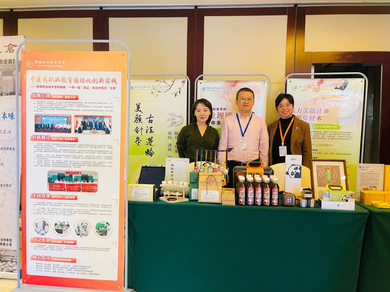 在大会交流环节,我校代表积极展示办学成果,重点推介了学校独具特色的 “技术服务+职业培训”职业教育出海模式,分享了中医药国际推广与职业技能培训的“雅职经验”。现场,我校通过校企合作产品、附属医院特色制剂等实物,生动呈现了在中医药临床转化与服务地方健康产业方面的扎实探索,吸引了全国同行的广泛关注。