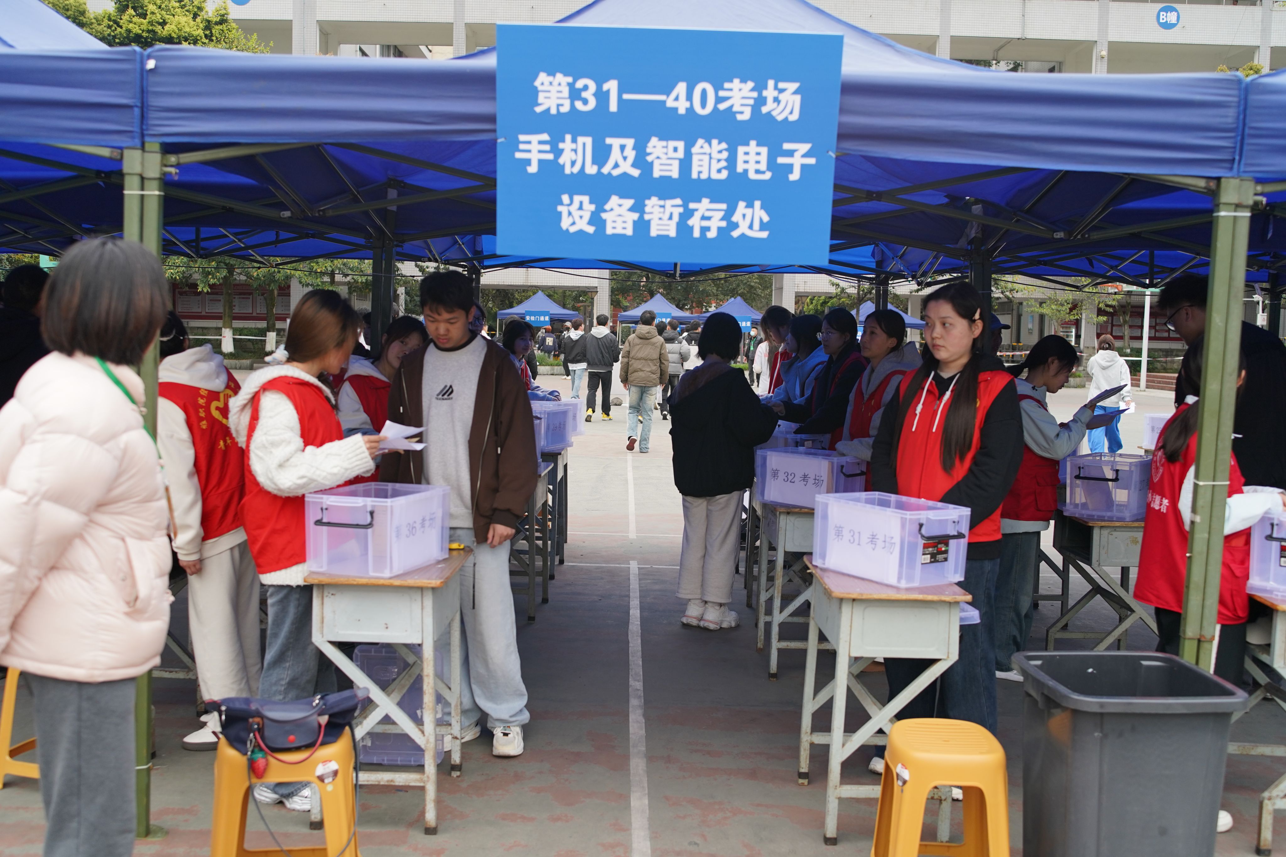 考试当天,校园里处处是考生们朝气蓬勃的身影,也藏着学校细致入微的关怀。工作人员提前到岗,投入助考服务工作中,考生们手持准考证,在工作人员的引导下有序完成身份核验、安检,顺利进入考场。考点还设立了详细的考生指示牌,设有候考区、医务室、饮水处等多个服务点,组织志愿服务队为考生提供帮助、解疑答惑。考务人员严格按照国家考试的规格、标准和要求,认真负责,考场秩序井然,考试过程规范、公正。