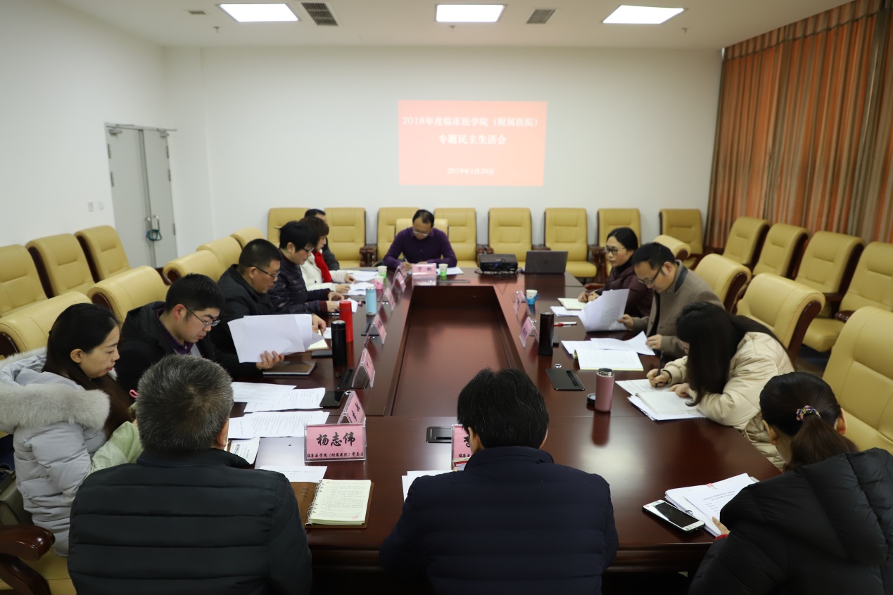 【本网讯】临床医学院(附属医院)党总支于1月29日在门诊楼10楼会议室举行2018年度专题民主生活会,临床医学院(附属医院)7名党总支委员参加,学院党委委员、副院长樊先茂,学院党委委员、组织人事处处长夏安琼全程参与并督导,临床医学院(附属医院)院长薛正毅、副院长李本全列席,会议由临床医学院(附属医院)党总支书记祝继英主持。