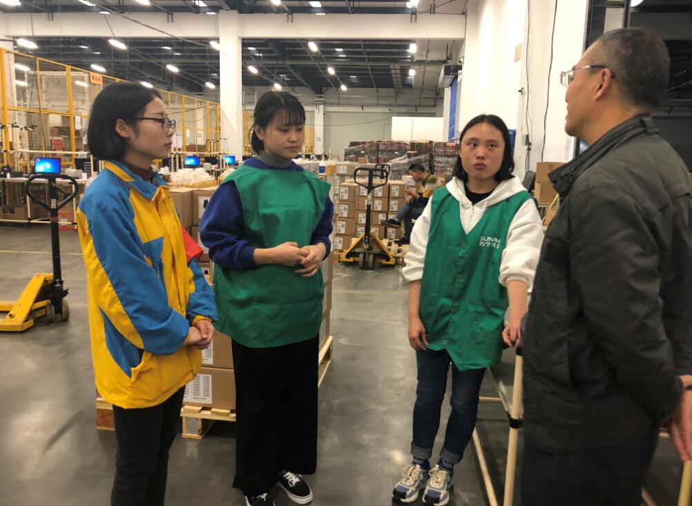 在成都苏宁集团人力资源部总监姜曼丽陪同下,检查组一行先后深入学生工作的各个分仓和一线工作岗位与实习学生逐一交流,了解学生的工作环境、劳动强度、技能锻炼、薪资待遇及公司对学生实习过程的管理和安排情况。