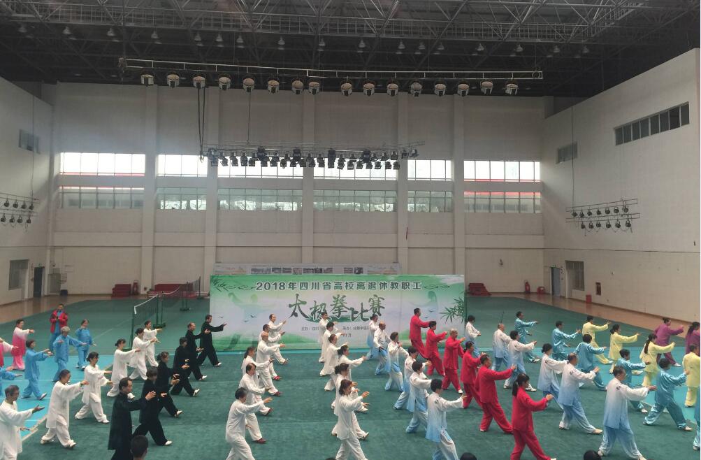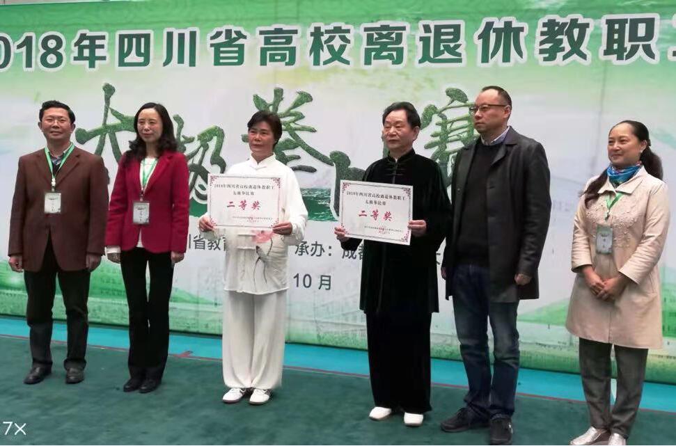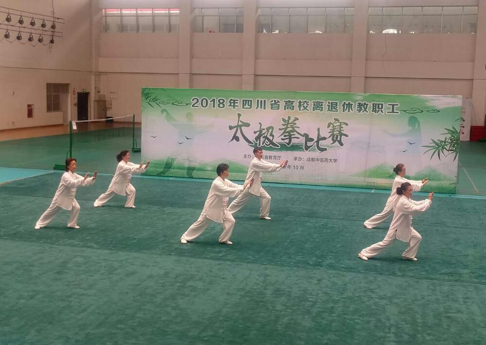 【本网讯】近日,2018年四川省高校离退休教职工太极拳比赛在成都中医药大学温江校区体育馆举行,此次比赛由四川省教育厅主办,成都中医药大学承办。来自全省12所高校代表队参加比赛,我院离退休教职工彭述芳、冯霞、李桂珍、张忆、刘培根、邵鹏辉、肖洪珍7位老同志组成的太极拳代表队参加了本次比赛。比赛场上,太极拳代表队的队员在比赛场上一招一式,整齐归一,刚柔并济,中正安舒。经过激烈角逐,我院代表队获得二等奖的好成绩,充分展示了我院退休教职工良好的精神面貌。