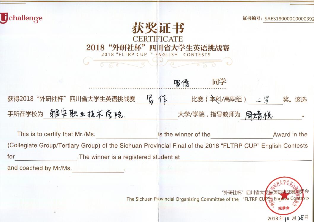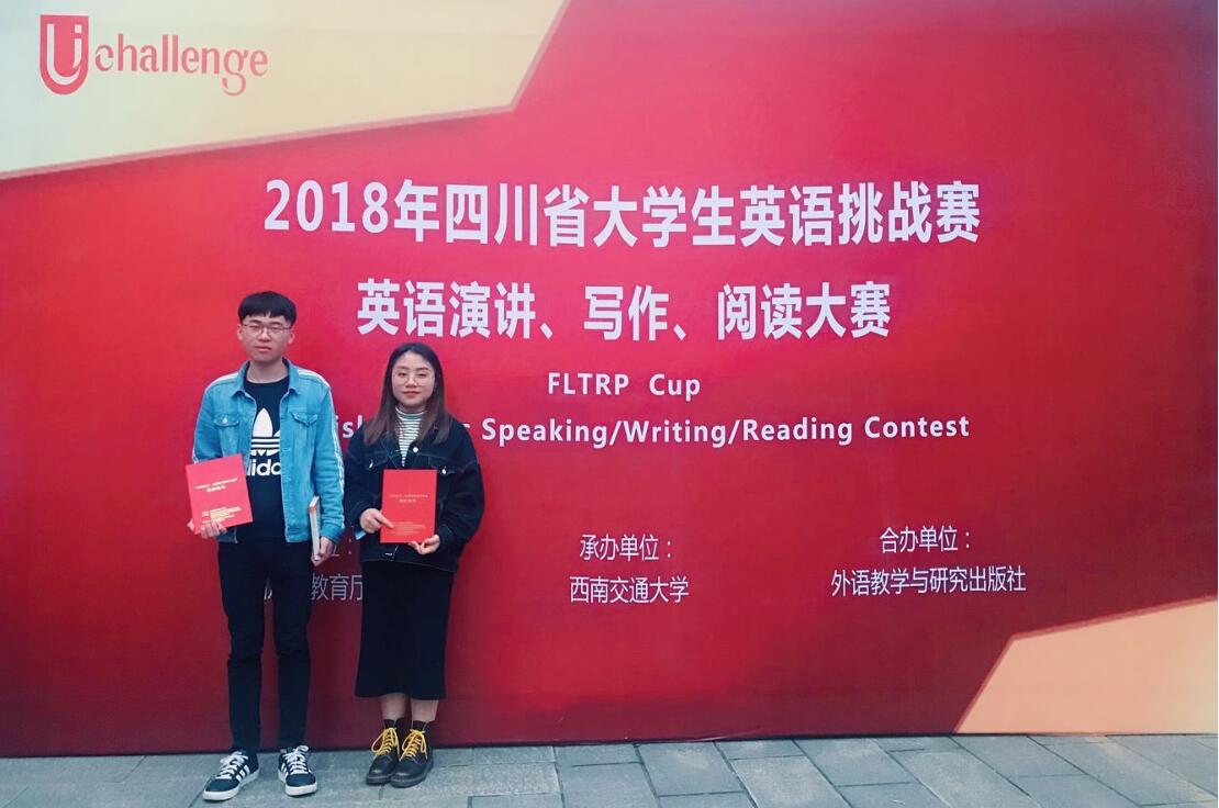 2018年四川省大学生英语挑战赛(UChallenge)(四川省大学生英语演讲大赛、英语写作大赛和英语阅读大赛)是由四川省教育厅主办,西南交通大学、外语教学与研究出版社承办的三项英语赛事。吸引了四川省各大高校的学生积极报名参赛。大赛分为本科组和高职高专组两个组别进行评选,其中阅读、写作比赛为现场机考,演讲比赛由定题演讲、即兴演讲和问题作答构成。我院学生积极参与此项赛事,提高了学生学习英语的积极性及英语专业应用能力,增强了学生的跨文化交际意识,开拓其国际视野,提升其国际素养。