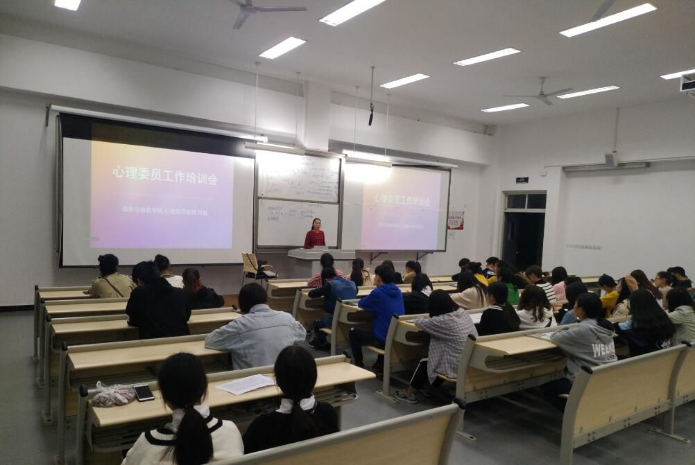 【本网讯】为了促进药学与检验学院大学生的心理健康发展,形成健康的心理品质,发挥心理委员在学生心理健康工作中的重要作用,同时推进药学与检验学院的心理健康工作常态化发展,经学院心理健康中心王可晖老师的指导, 11月1日,药学与检验学院的心理指导老师何群在经开区实训与服务中心教室2104召开心理委员工作培训会。