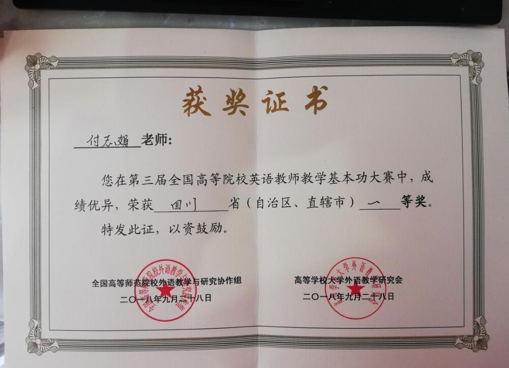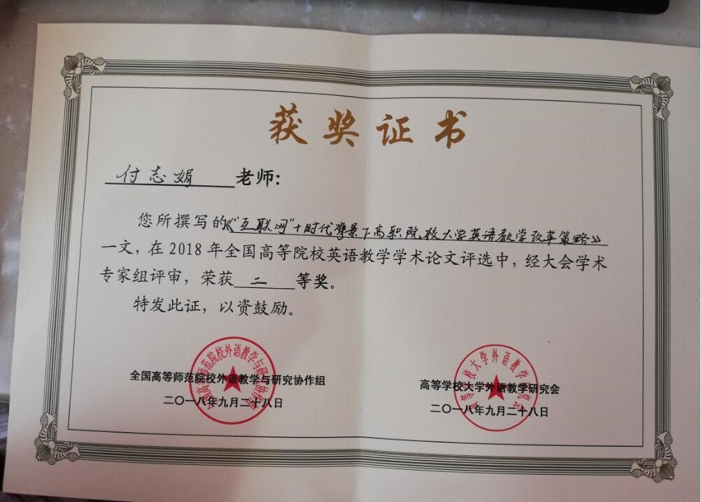 【本网讯】2018年第三届全国高等院校英语教师教学基本功大赛结果近期揭晓。我院英语教师付志娟代表学院参加了大学英语组的比赛。经过激烈角逐,付志娟老师以扎实的专业基本功和出色的教学表现,荣获2018年第三届全国高等院校英语教师教学基本功大赛四川省一等奖,其论文《“互联网+”时代背景下高职院校大学英语教学改革策略》同时荣获2018年全国高等院校英语教学学术论文二等奖。