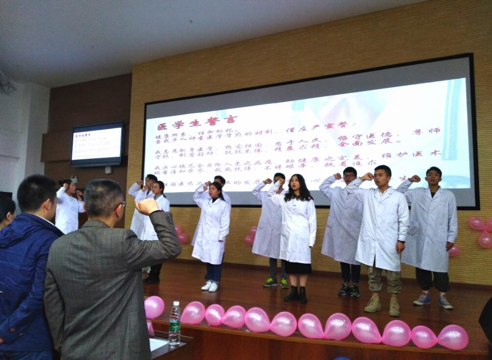 李千千同学代表18级新生表明要牢记医学生责任与使命,立志成为合格医学生的决心。随后在领誓人陈进同学的带领下,全体同学庄严宣誓:为除人类之病痛,为助健康之完美,为祖国医药卫生事业的发展奋斗终身。