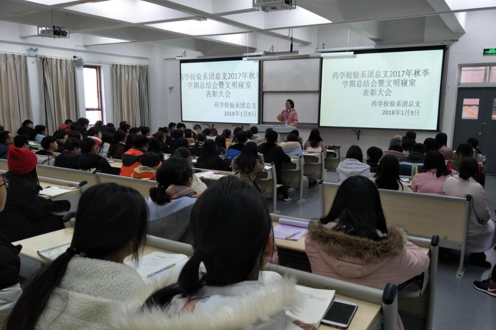 【本网讯】为了总结本学期的工作,加强学生会成员之间的交流与沟通,了解、纠正工作中的错误和不足,更好地开展今后工作,1月9日,药检系团总支组织学生会干部干事在实训与服务中心1104教室召开了2017年秋季学期总结会暨文明寝室表彰大会。团总支书记鲜敏、副书记陈静及所有新老干部、干事、寝室代表共计200余人参会。会议由鲜敏主持。