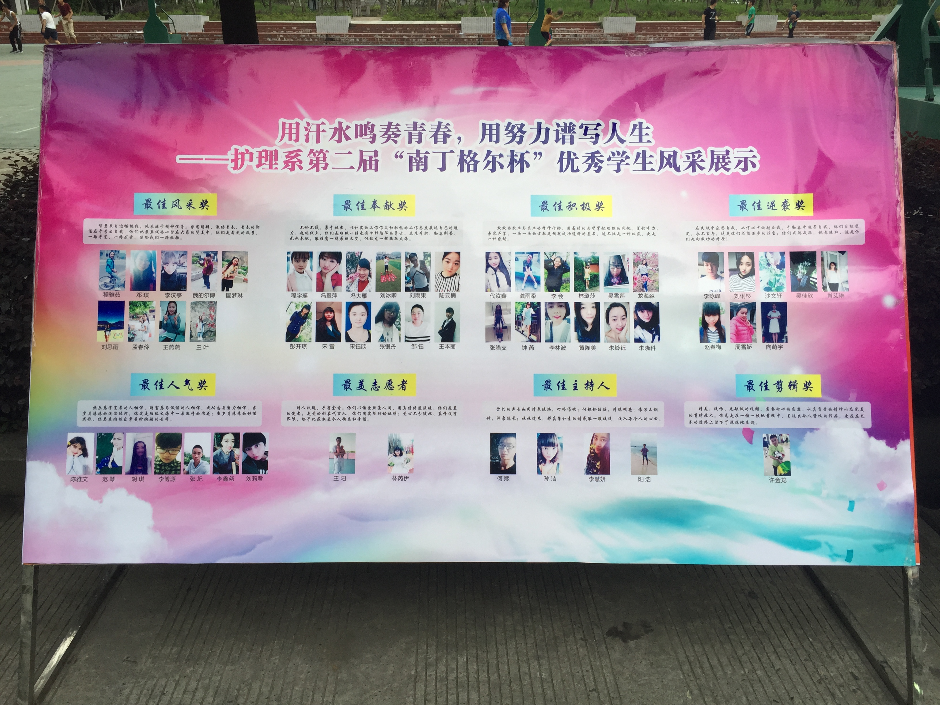 根据本学年护理系学生工作开展情况和同学们在“南丁格尔”杯系列活动中的表现,按照学生会和普通同学分开评选的原则分别设置了集体奖和个人优秀奖。与以往相比,本次评选活动最大的亮点在于在普通同学中增设了包括最佳人气奖、最佳奉献奖、最佳积极奖、最佳风采奖、最佳逆袭奖、最佳剪辑奖、最佳主持人、最佳志愿者等在内的多项个人奖,同时,护理系还特别为以上获奖同学做了展板进行风采展示。经评选,学生会中共有4个部门、80个同学分获集体奖和个人奖;普通同学中共有17个班级、58个同学分获集体奖和个人奖。