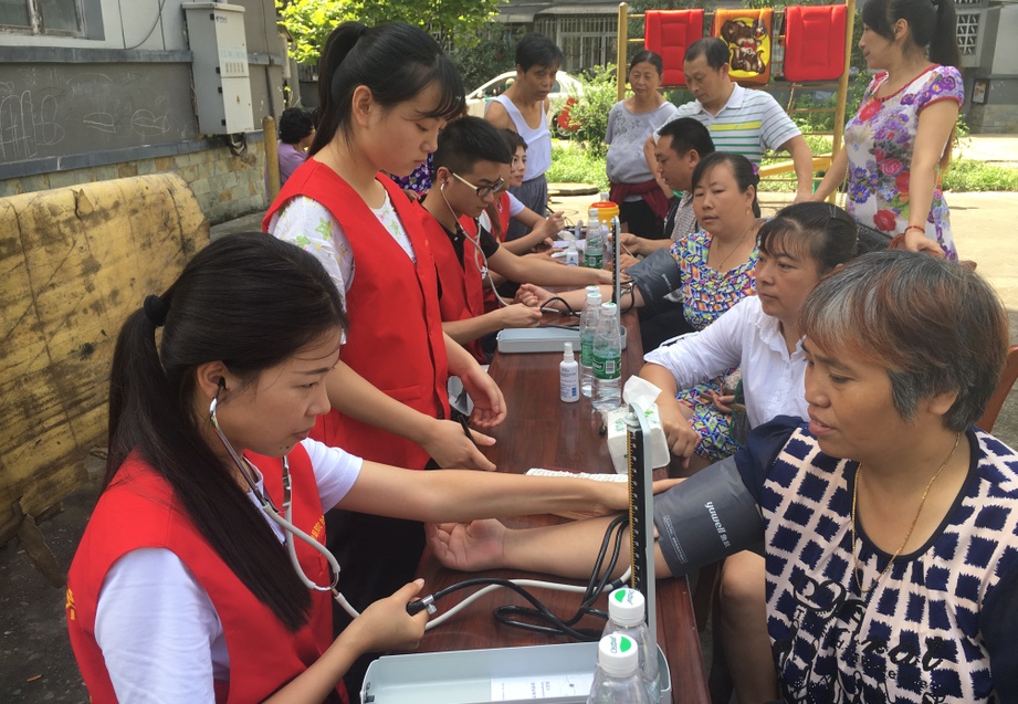 到达社区后,志愿者立即行动起来布置现场,挂横幅、搬板凳桌子、准备服务工具等,大家干得热火朝天。活动还未正式开始,就有不少居民前来等候。活动中,志愿者们为社区居民测量血压血糖,耐心地检查和解答居民的健康问题,向他们发放夏季防暑药品。同时,联合社区志愿者,师生志愿者走访了社区内几位老人的家,根据他们的居住环境情况,讲解有针对性的保健知识,提出急需解决的问题和建议,并为他们送去夏季防暑药品和一些生活必需品。