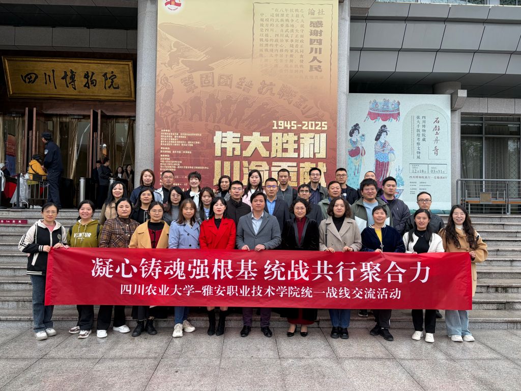 为深入学习贯彻新时代中国特色社会主义思想,进一步巩固团结奋斗的共同思想政治基础,10月24日,学校党委宣传统战部与四川农业大学党委统战部联合举办“凝心铸魂强根基 统战共行聚合力”统一战线主题交流活动。学校党委常委、宣传统战部长、工会主席夏安琼带队,我校新当选的民盟、民建两个党派的全体支委及无党派人士、归国留学人员代表20余人,与四川农业大学四个民主党派近20名成员同赴成都开展研学交流。