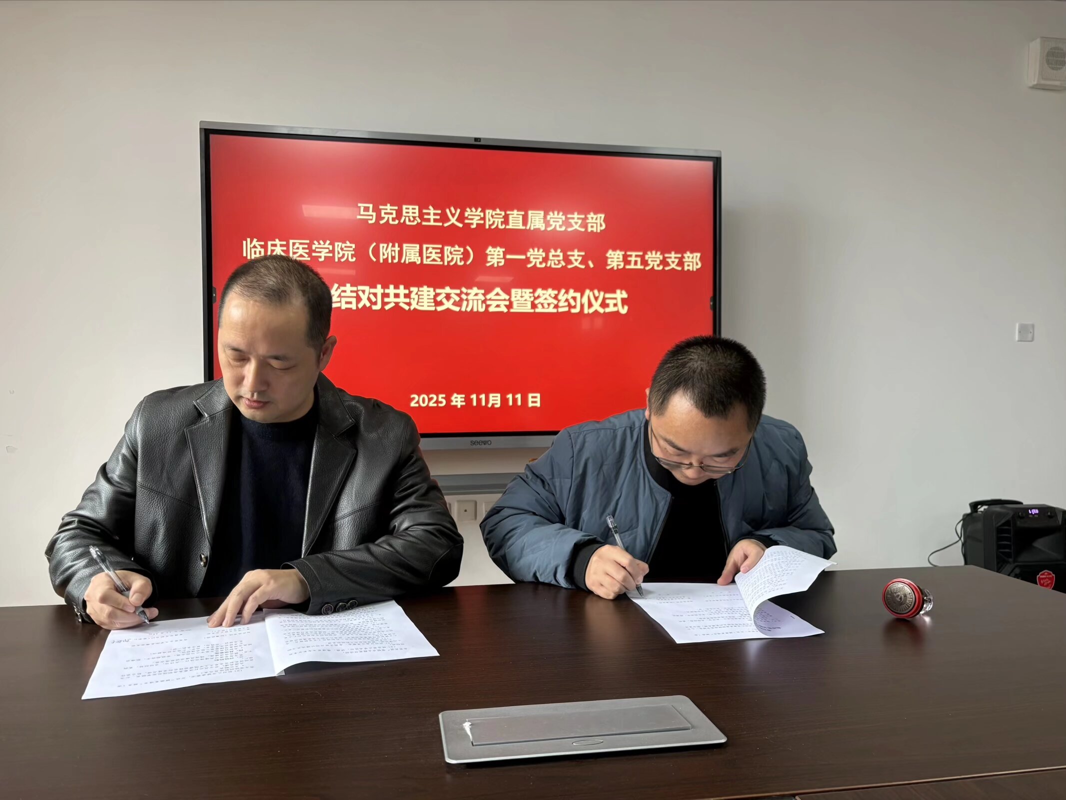 11月11日下午,马克思主义学院直属党支部与临床医学院(附属医院)第一党总支第五党支部在青年路图1005举行了党建结对共建交流会暨签约仪式。双方共同签署了《党建结对共建协议》,明确了双方合作的核心方向与具体路径,为后续协同发展奠定了坚实基础。
