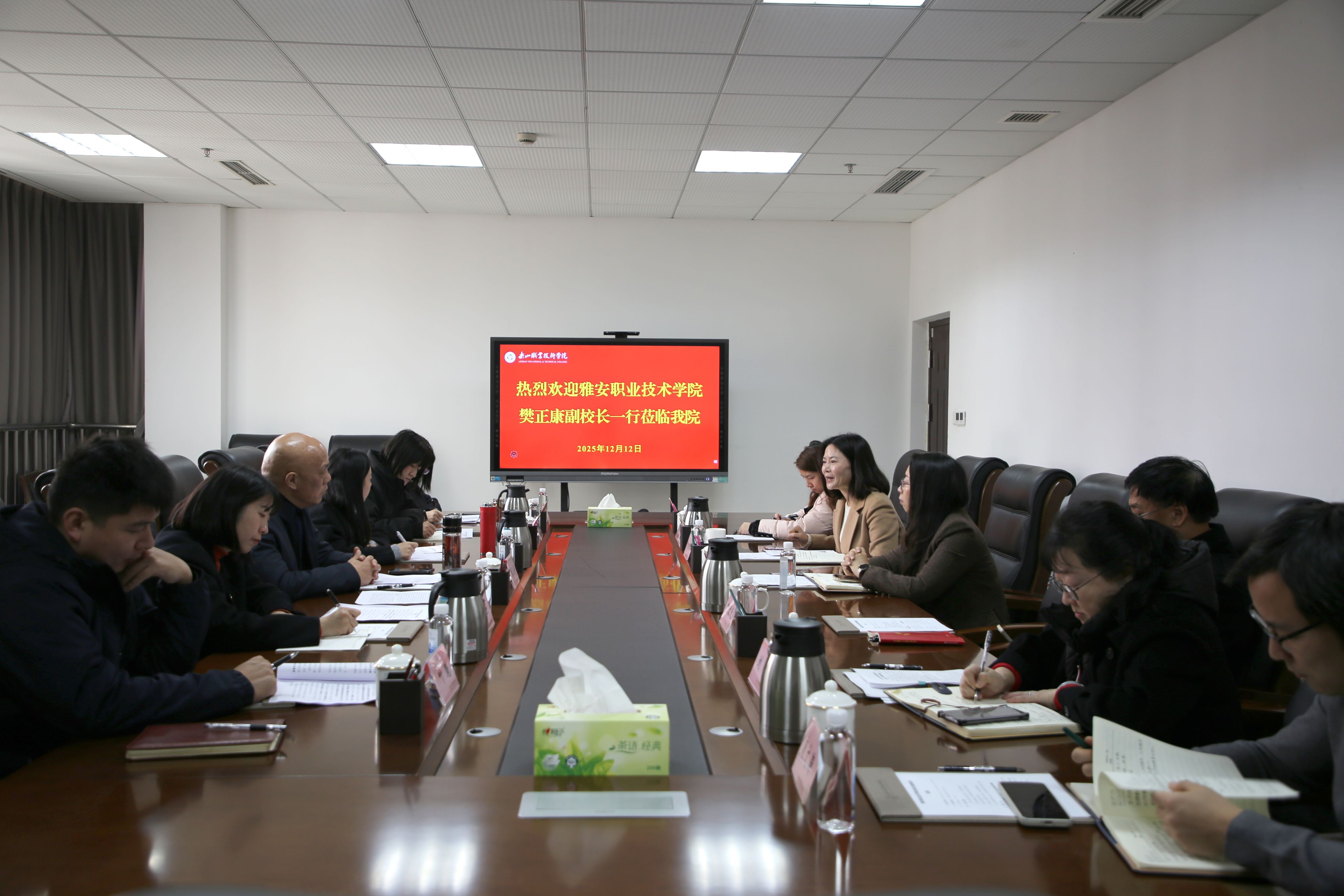 12月12日,学校党委常委、副院长樊正康率队前往乐山职业技术学院(以下简称“乐山职院”),就留学生教育教学管理工作进行专题调研。此次调研旨在全面提升留学生招生、教学管理与服务水平,推动人才培养高质量发展,做好2025年留学生管理办法修订工作,学习借鉴兄弟院校在国际教育领域的先进经验。学校继续教育与国际交流处、学生处、教务处、保卫处相关负责人参与调研。