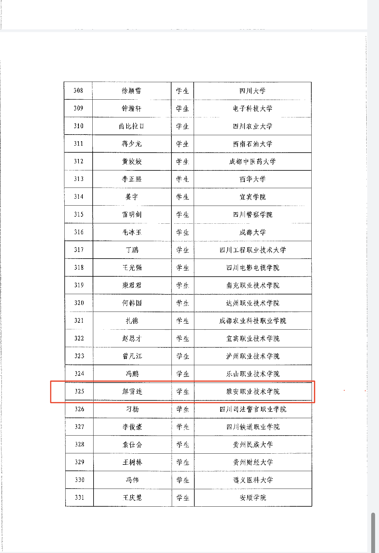 近日,教育部、中国教育发展基金会公布2024-2025年度“高校毕业生基层就业卓越奖学(教)金”名单,今年全国418名毕业生获得此项荣誉,四川省高校毕业生有20人获得,其中仅有9所高职专科院校毕业生入选,我校2017级护理专业毕业生解雪连位列其中。