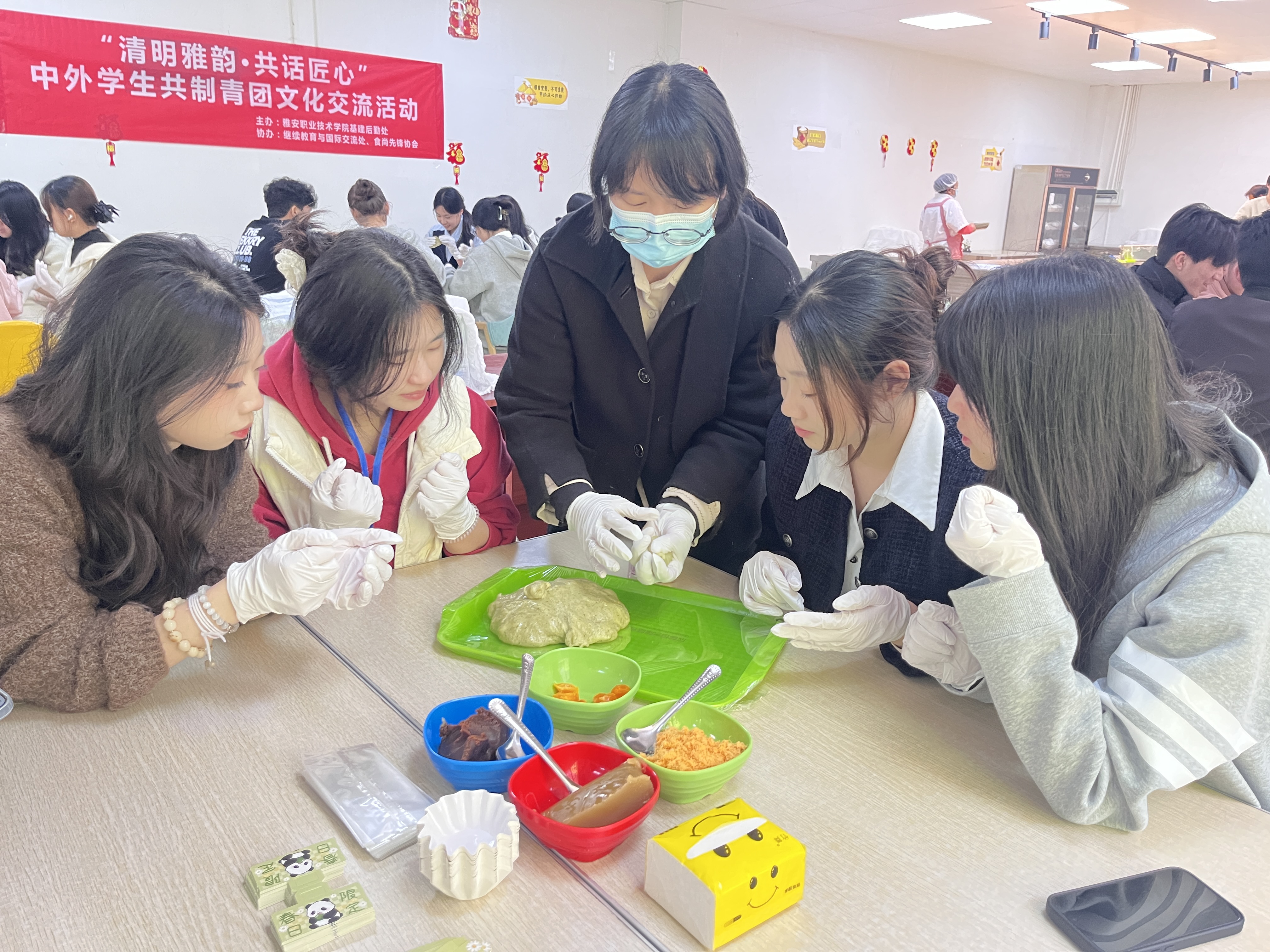 清明前夕,为弘扬中华优秀传统文化,推进“三全育人”实践,3月31日下午,由基建后勤处、继续教育与国际交流处联合举办的“清明雅韵·共话匠心”中外学生共制青团活动在青年路校区食堂开展。50余名中外学生共同参与。