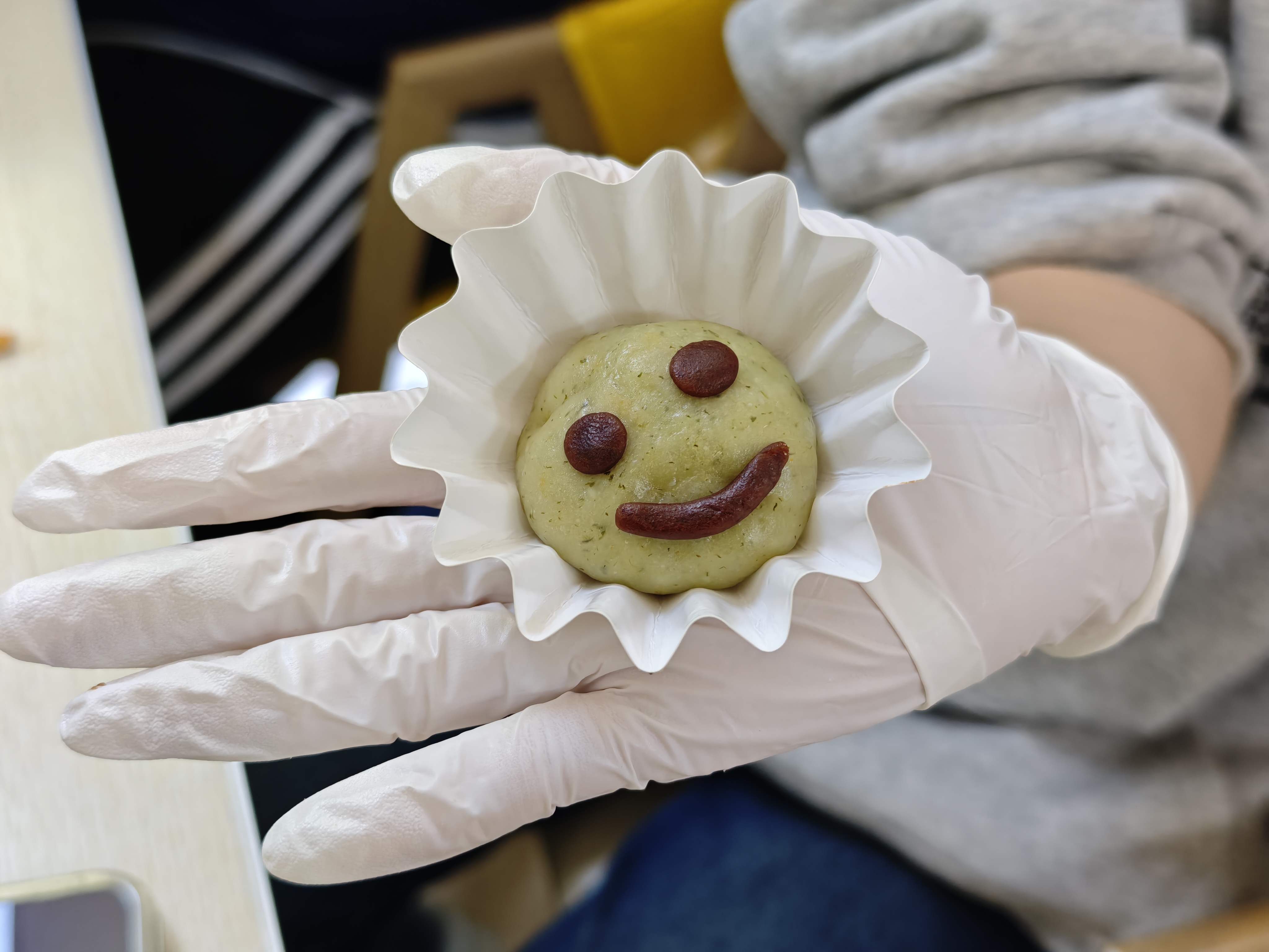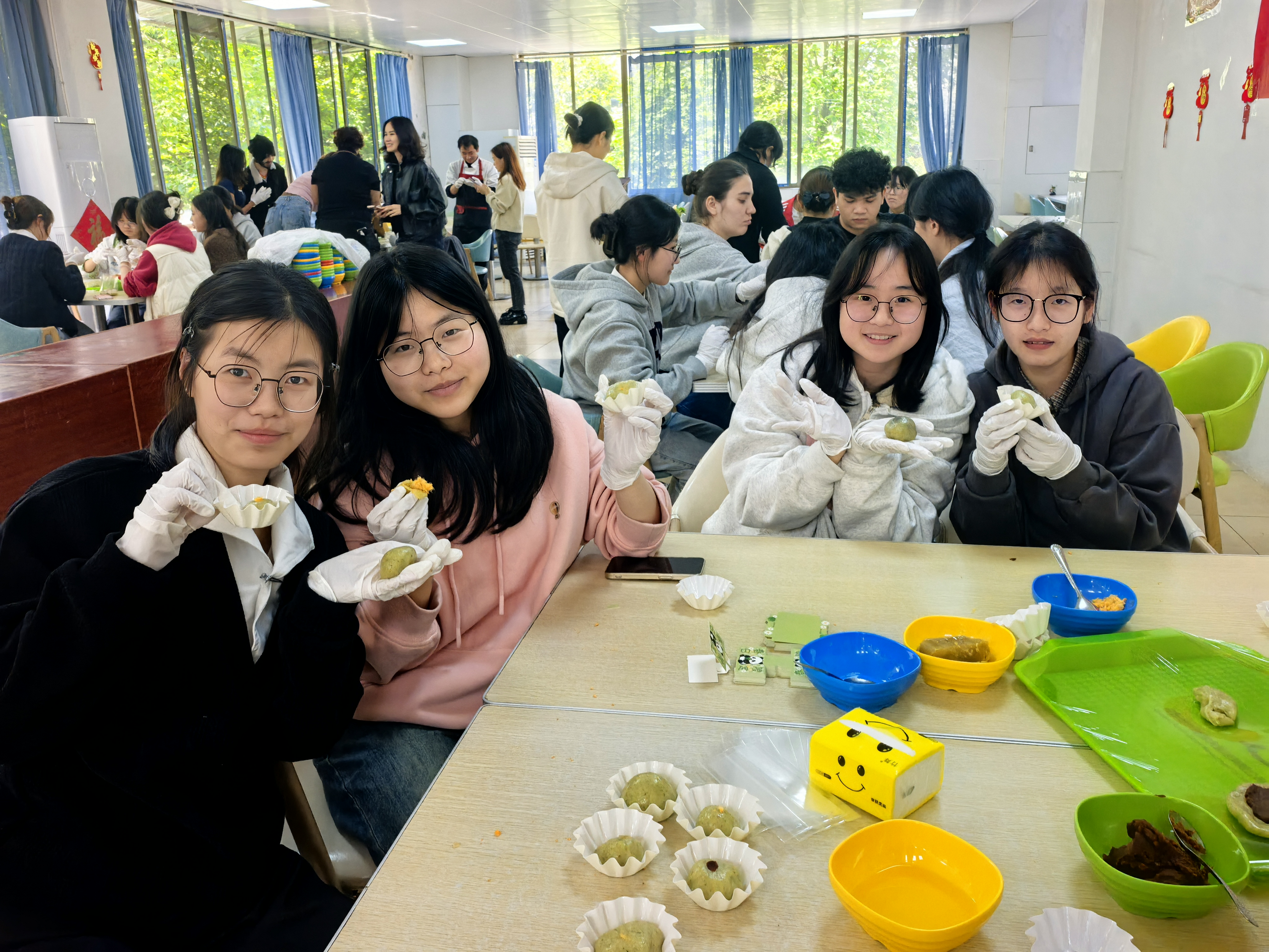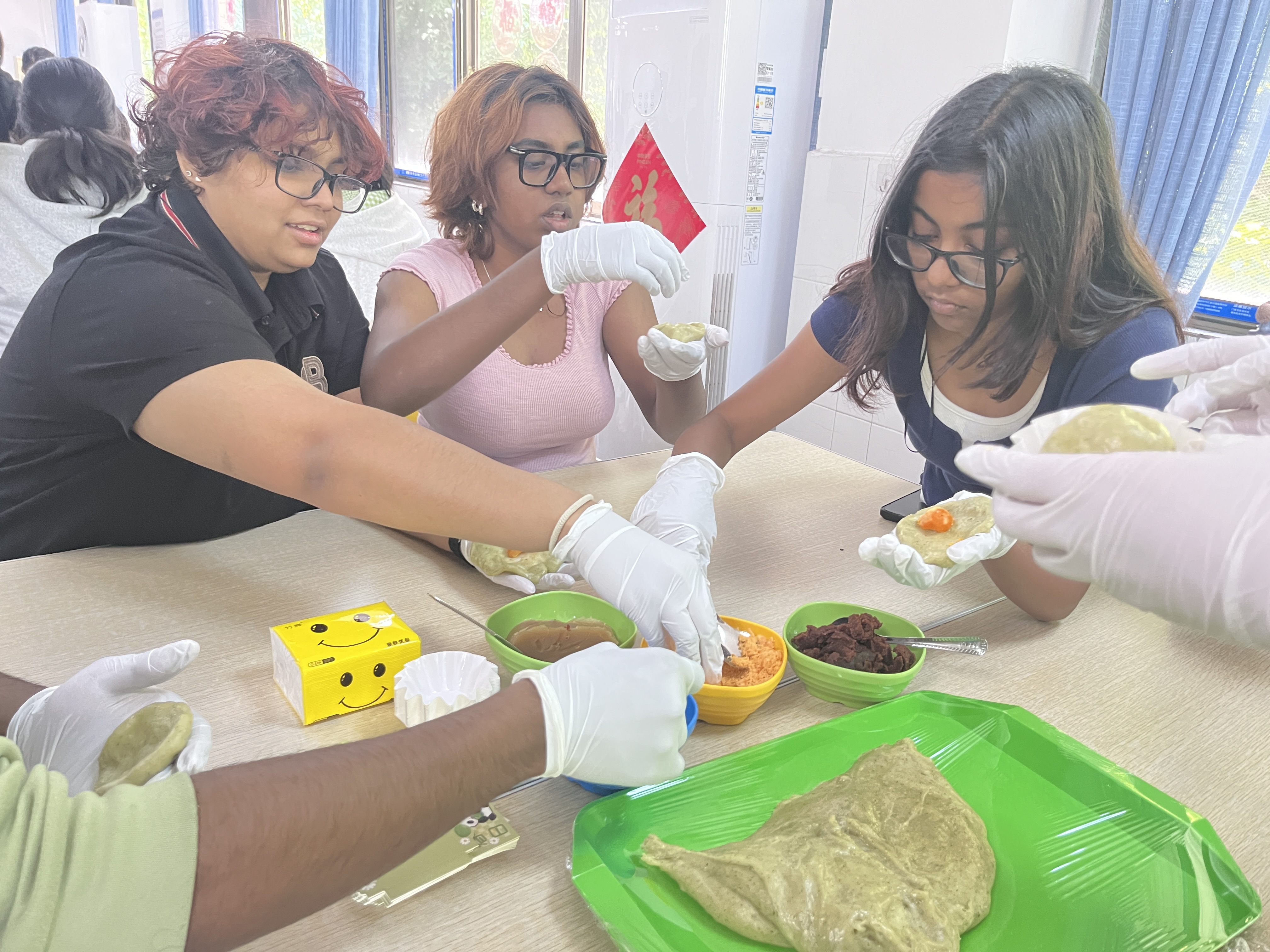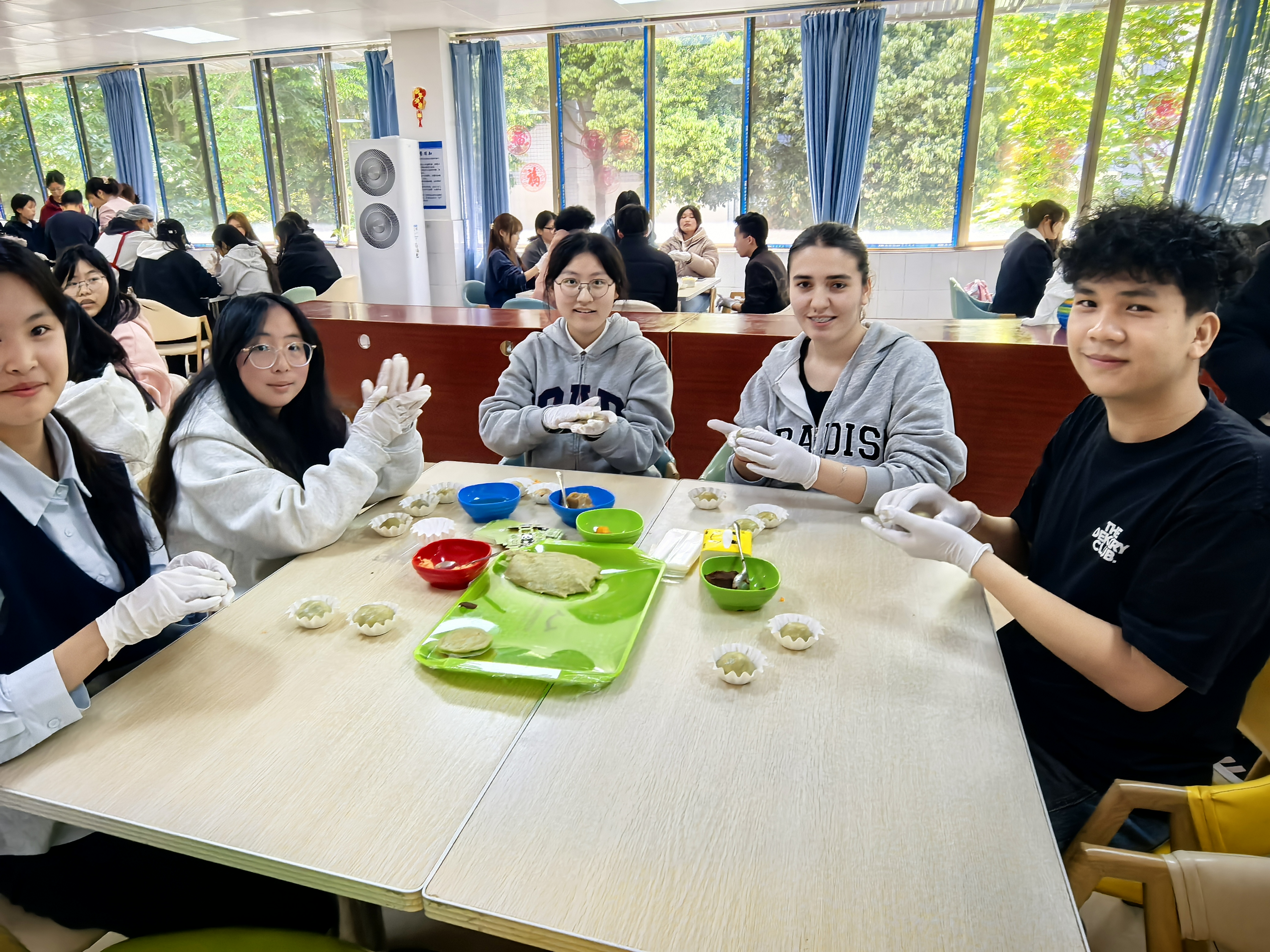 活动现场,食堂面点师傅现场教学,从处理艾草、揉制面团到包馅成型,逐步讲解青团制作技艺。中外学生混合编组、协同制作,在动手实践中体验清明饮食习俗,感受非遗文化的魅力。