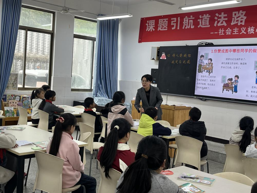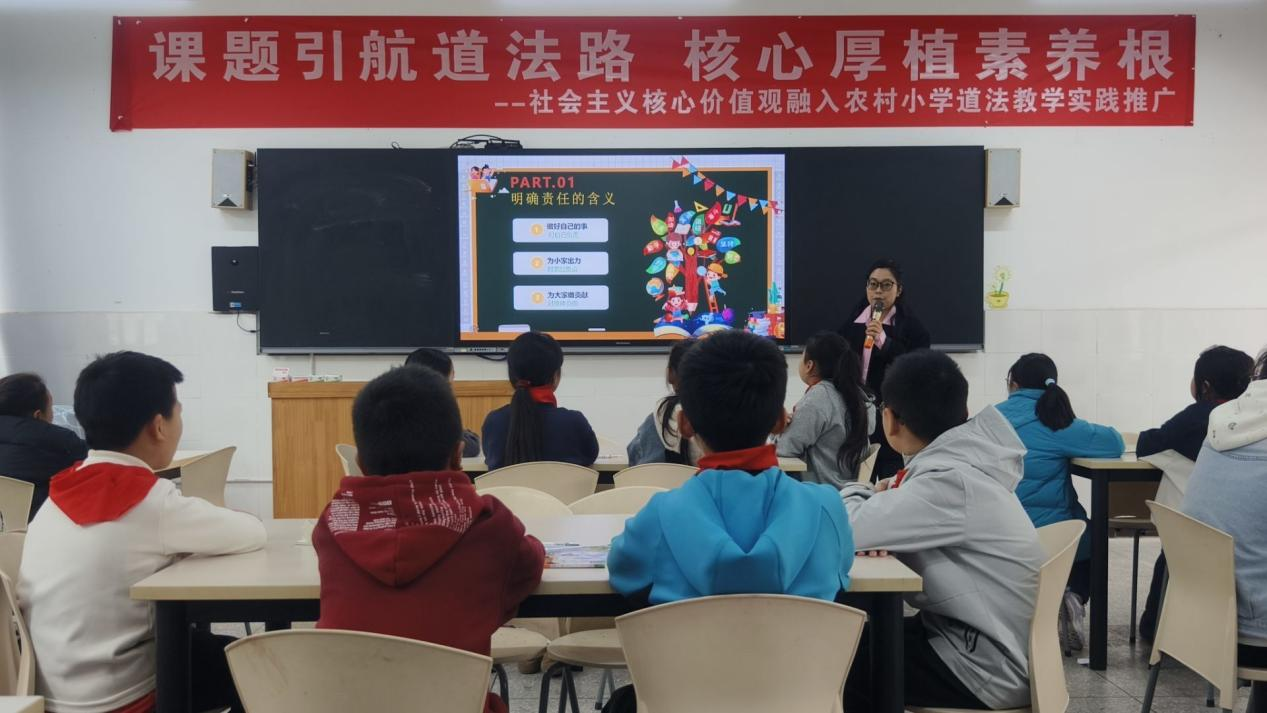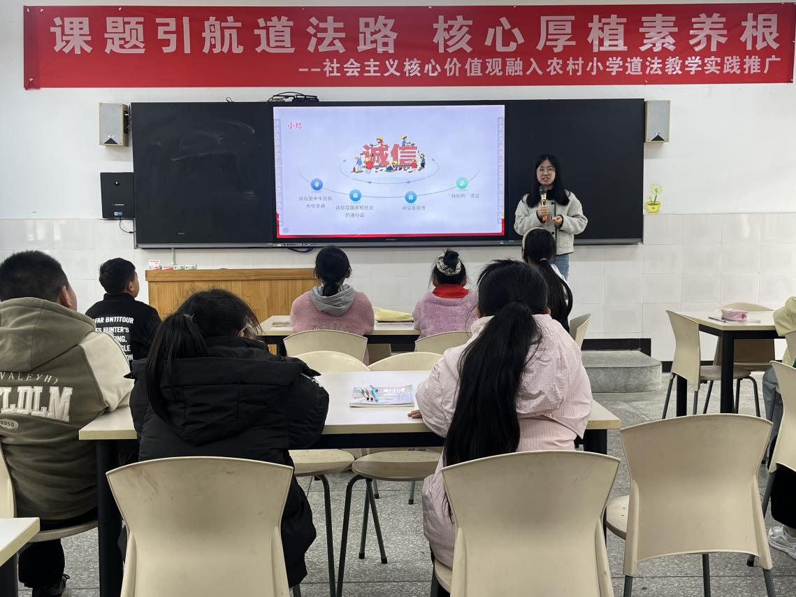 在课堂展示环节,始阳第三小学教师金彦辰执教《待人要诚信》示范课,以贴近生活的案例引导学生理解诚信内涵。马克思主义学院教师胡梦铃、王丹分别以“诚信”与“责任”为主题进行教学展示,将理论阐释与生活实际相结合,拓展了学生的认知视野,增强了思政课的感染力与思想性。